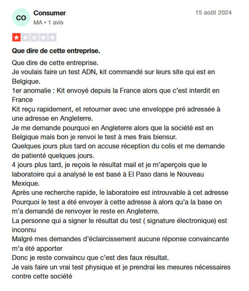 En revanche, le laboratoire belge une tarification variée (50 €-269 €) avec des délais variables selon le type d’analyse (3 jours à 3 semaines).