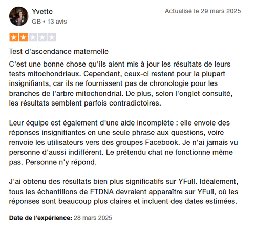 Sur Trustpilot, FTDNA obtient une note de 3,9/5 sur 218 avis. Analysons maintenant de près les retours des utilisateurs.