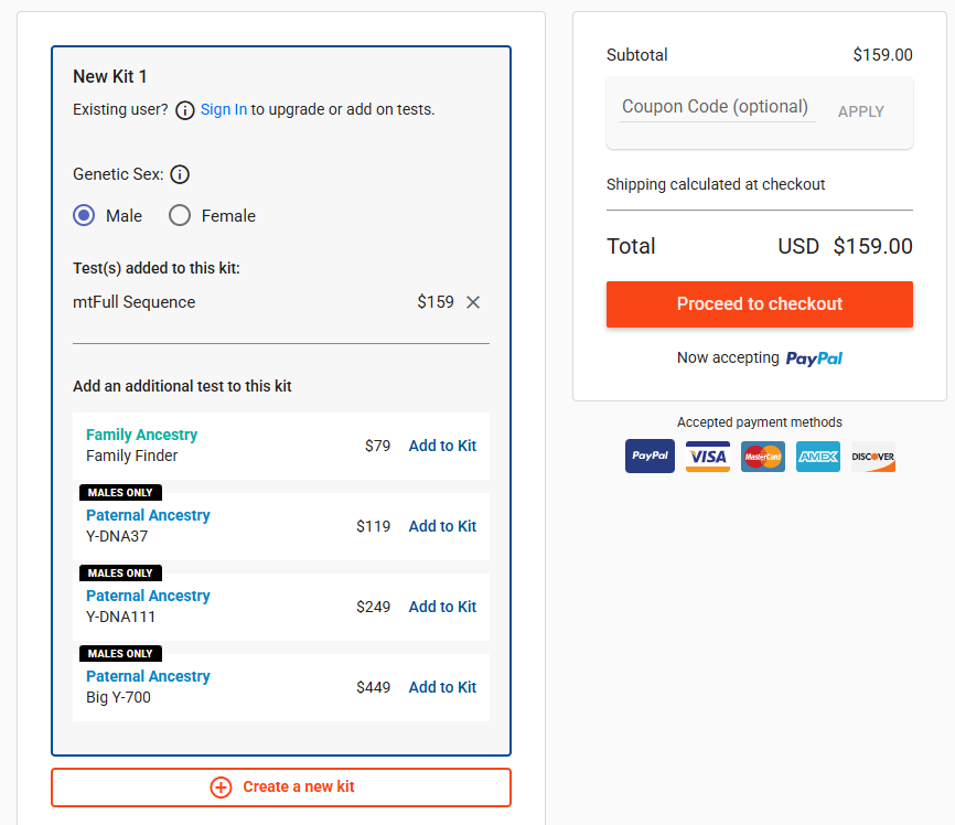 Sélectionnez votre test sur le site FTDNA. Créez votre compte et réglez par carte bancaire sécurisée.