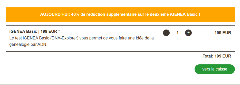 Rendez-vous sur le site d’iGenea et cliquez sur « Commandez le test ». Choissisez votre kit selon votre budget, remplissez vos informations et validez la commande par carte bancaire (visa, Mastercard) ou PayPal