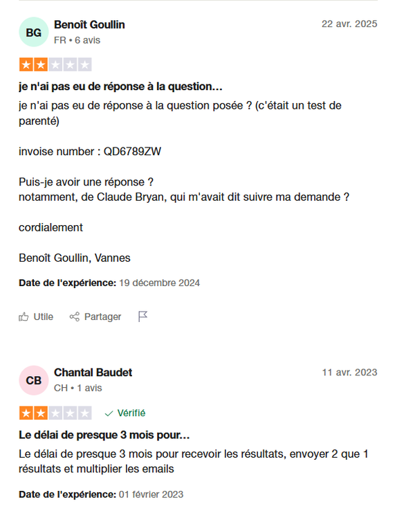 Le taux de fiabilité dépasse 99,97 % qu’il s’agisse d’un test d’ascendance ou de paternité. Vous pouvez donc vous appuyer sur leurs rapports en toute confiance pour vos recherches généalogiques.