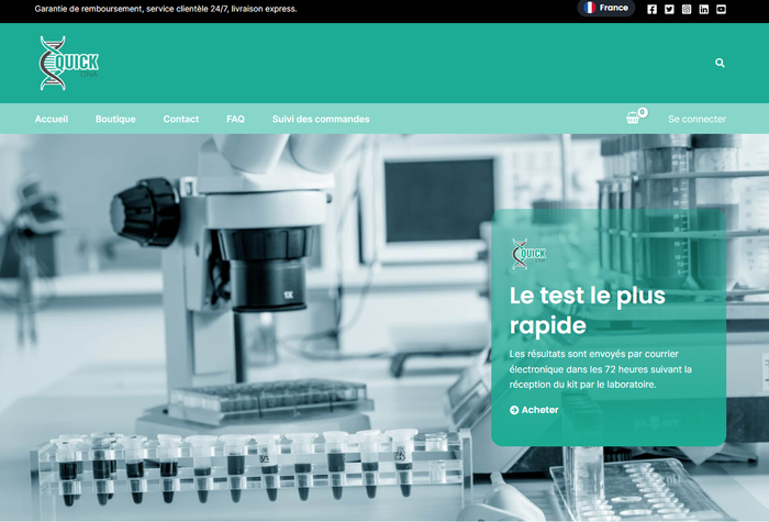 Le site de Quick DNA affiche une interface simple et fluide. Dès l’arrivée sur la page, vous pouvez sélectionner la langue de votre choix. La navigation principale est bien structurée avec les sections Accueil, Boutique, Contact, FAQ et suivi de commandes.