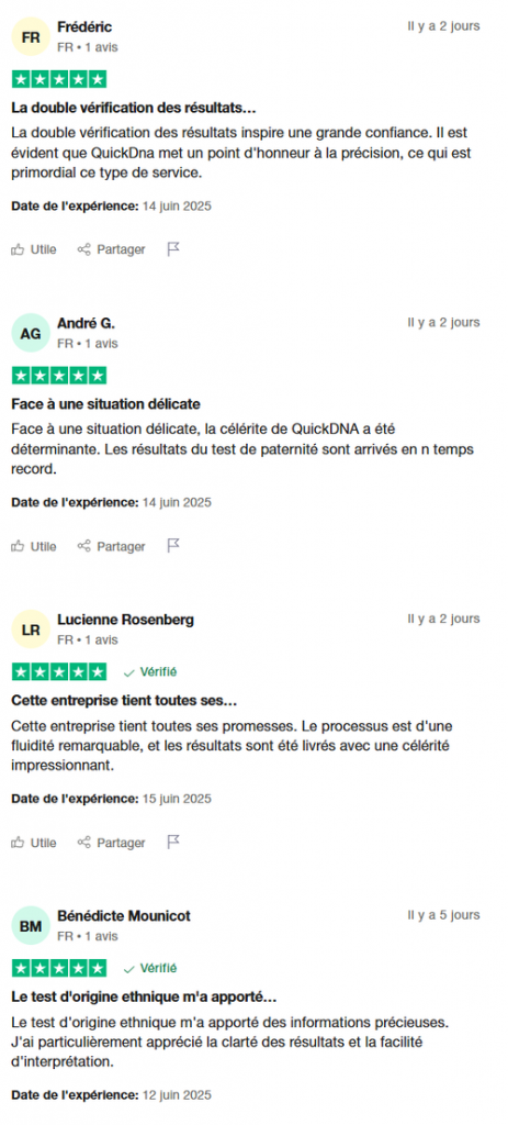 Les clients apprécient la rapidité de livraison, la fiabilité et la précision des résultats d’analyse ADN de Quick DNA. La méthode de double vérification employée par le laboratoire inspire une grande confiance aux clients.