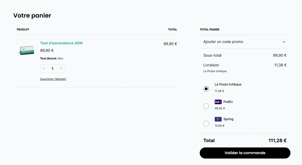 Rendez-vous sur le site web français de QuickDNA et sélectionnez le type de test ADN souhaité parmi les options disponibles. Choisissez votre mode de paiement préféré et validez votre commande pour finaliser l’achat.