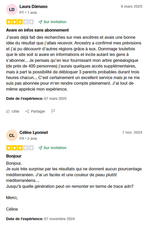 Certains utilisateurs regrettent un accès trop limité sans abonnement, même avec un arbre déjà bien avancé. La précision des résultats ethniques, parfois en décalage avec leur perception ou leur histoire familiale connue, est aussi remise en question.