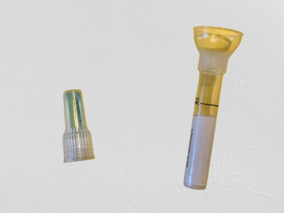 Crachez dans l’entonnoir jusqu’à la ligne noire (sans bulles). Retirez l’entonnoir, fixez le capuchon bleu avec la solution, puis secouez 5 secondes. Ne mangez, buvez, fumez ou ne mâchez pas de chewing-gum 30 minutes avant.