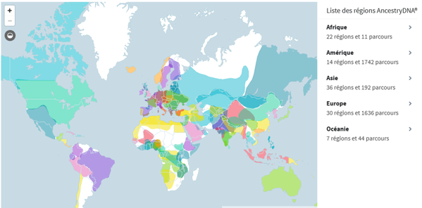 Découvrez la répartition géographique de vos ancêtres à travers le monde, avec des pourcentages détaillés