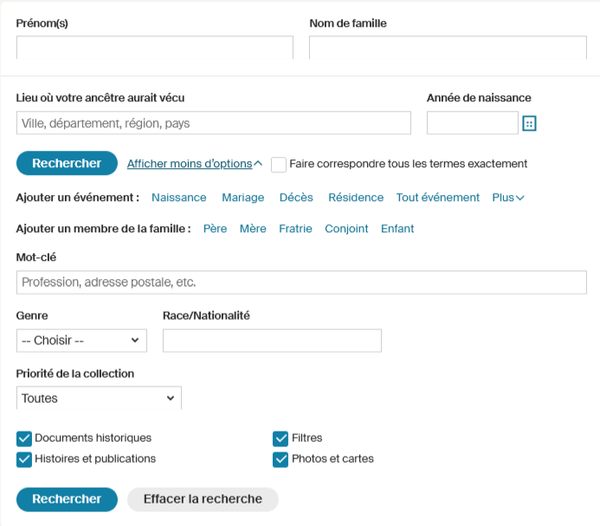 L’outil de recherche généalogique d’Ancestry donne accès à des millions d’archives : actes de naissance, listes militaires, recensements (dont le recensement américain de 1950), registres d’immigration, photos et arbres partagés. Vous pouvez filtrer par collection et lieu pour affiner vos recherches.